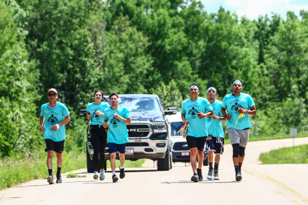 It’s Rice Lake Village on the White Earth Reservation – at the site of the mother lode of wild rice, Lower Rice Lake. Lew Murray stands in front of the gathering — about 200 or so people. They have come together to greet the runners who’ve just covered 26 miles to honor the wild rice — and protect it. This is a joyful crowd. Local residents are just starting to get together out-of-doors after pandemic restrictions ease, and we are all happy to see each other.