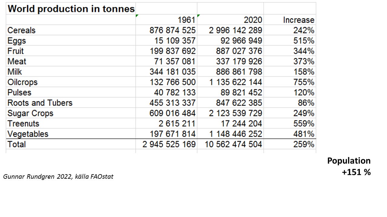 As you can see from the table, the total agriculture output, in the rather crude measure weight, increased with 259% between 1961* and 2020. Meanwhile the population increased with 151%. As I have stated many times before, any talk about global food shortage and a need to increase production even more is pure nonsense.