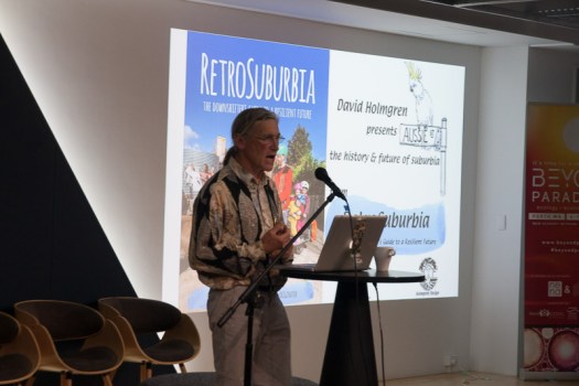David Holmgren: I think it also helps deal with one of the problems of copying. As we know, every design situation is different and requires a response to that situation. But the template and pattern of suburbia across whole suburbs and landscapes, and especially where there’s similar street layout and houses of similar age, there is that simpler act by which people do things; “oh look, they did that there, we can copy that”. And there’s more chance in those landscapes of that copying actually working whereas in a lot of rural contexts and a lot of more complex organisational contexts, it’s very hard for those copies to work. We recognise that a lot of people do things that way, and we all know as designers, that that’s not necessarily the best, and the idea of how can we uniquely respond to a situation is important, but people are into the baby steps of design. If we recognise design is a human literacy that potentially represents some degree of evolutionary transformation, at least at the scale of literacy and numeracy. Then that original vision I had in Environmental Design school, that our role is, not as expert designers, but people a little bit further down the track, to enable everyone to see themselves as designers and to find that power in the process, which is still I think, a struggle for so many people.